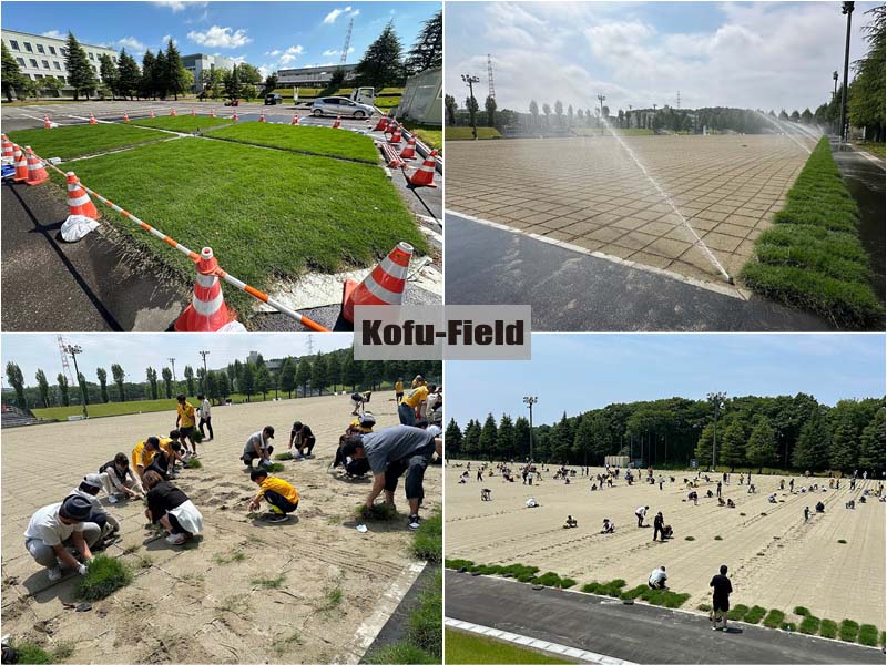 株式会社ベガルタ仙台様と学校法人東北学院様以外にも、人工芝はアイリスオーヤマ様との連携、天然芝は日本サッカー協会(JFA)グリーンプロジェクトのポット苗方式芝生化モデル事業との連携など、多くの関係者を交えてのプロジェクトでしたが、現場担当者の頑張りもあって無事に竣工した次第です。