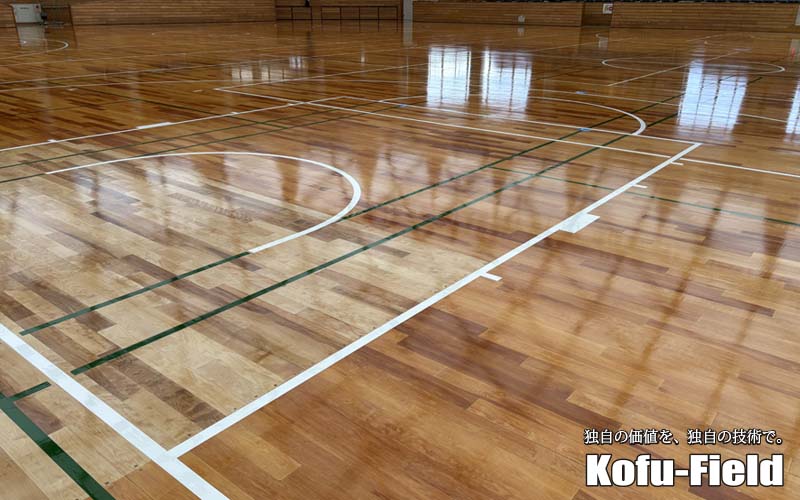 メインアリーナの移動式バスケットゴールの通り道を中心としたフローリング改修工事を担当させて頂きました。