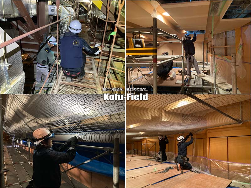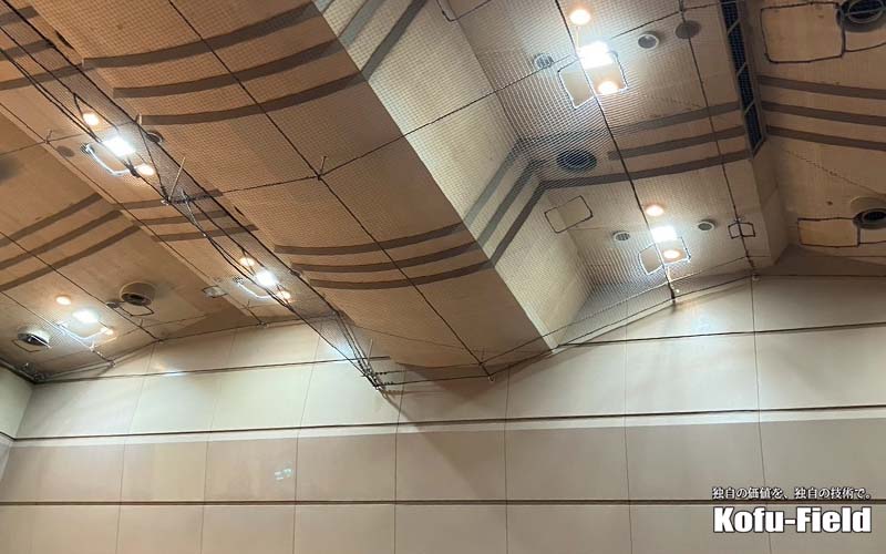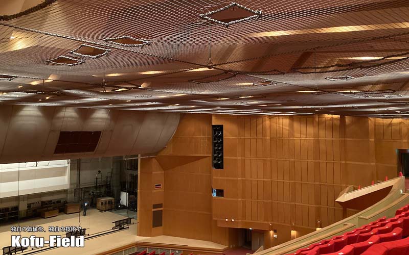 本工事では、既存建築物の耐震性能向上を目的として、ホール天井部に落下防止ネットを設置し、地震発生時における天井材の落下リスク低減を図りました。施工対象は小ホール(約263㎡)および大ホール(約958㎡)で、既存躯体を最大限活かしながら、現行の耐震基準に適合させる改修を行っています。