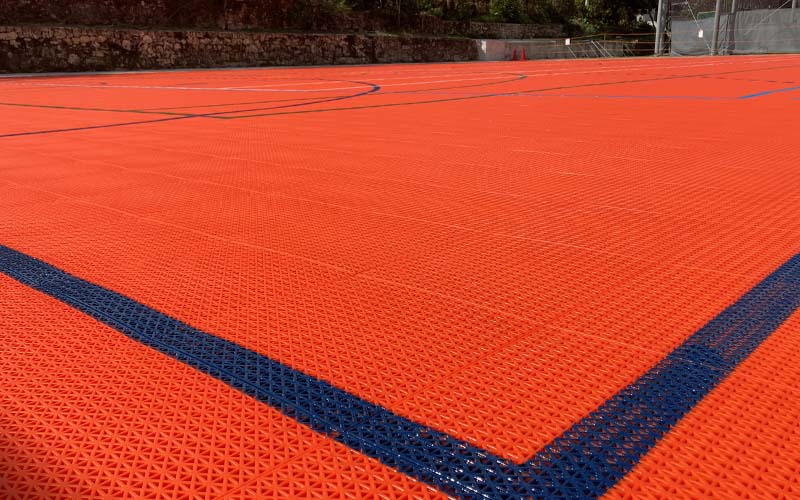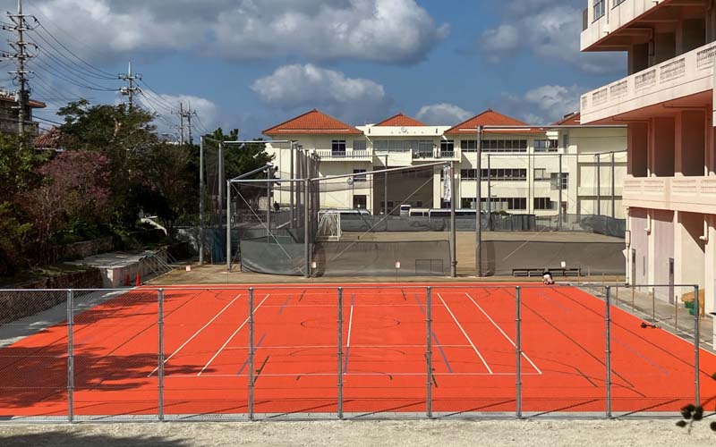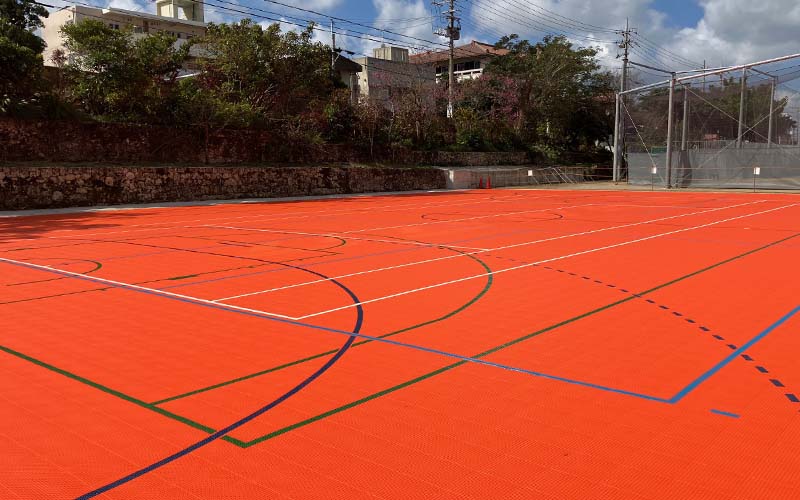 首里城近くという立地から、景観に配慮し、赤瓦をイメージしたオレンジ色のコートが採用され、地域性を感じられる印象的な仕上がりとなりました。