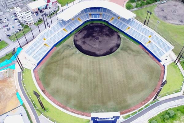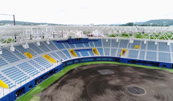 屋内練習場人工芝敷設工、投球練習場防球ネット、屋内練習場ブルペン形成、投球練習場防球ネット、天然芝ティフトン舗装、人工芝舗装、アンツーカ―舗装、他