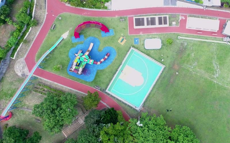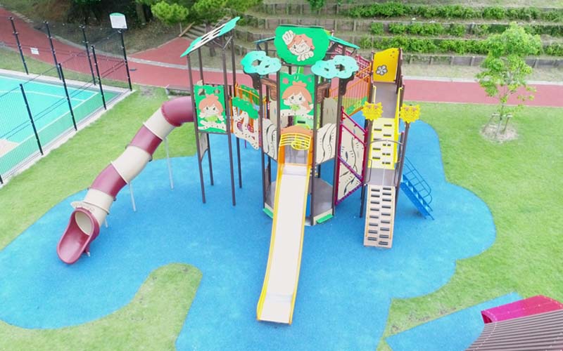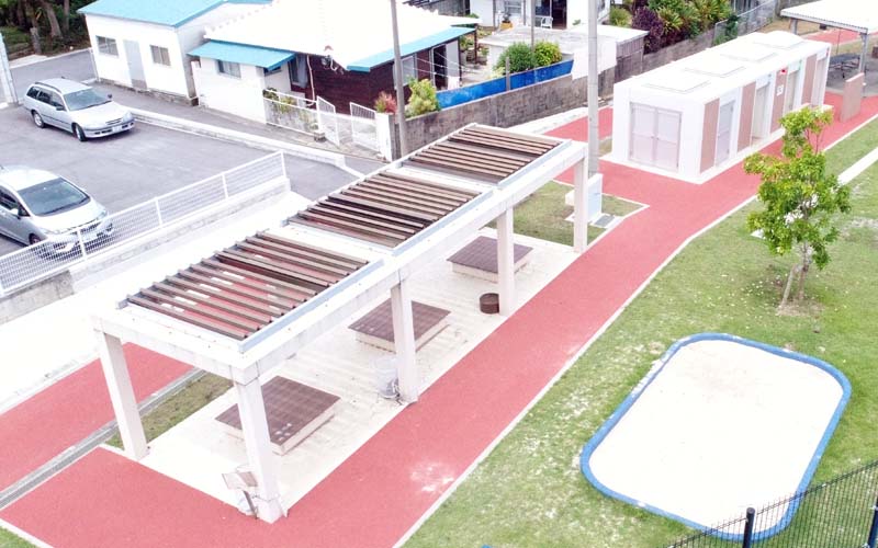 ■内容 複合遊具(きじむなー)1基 平ベンチ2基 かまどベンチ2基 4連パークトイレ 防災パーゴラ