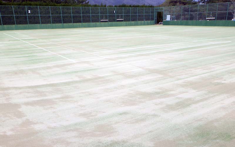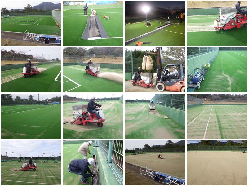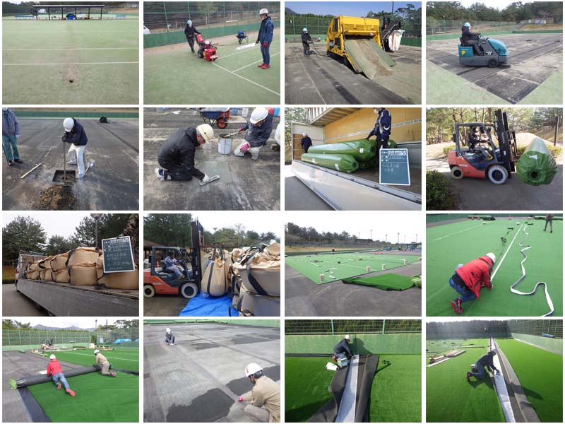 ■内容 テニスコート人工芝改修工事 3,200㎡(人工芝:Jorkyturf HD19) テニスポスト・埋設管