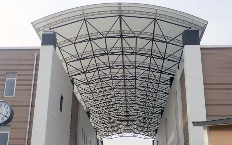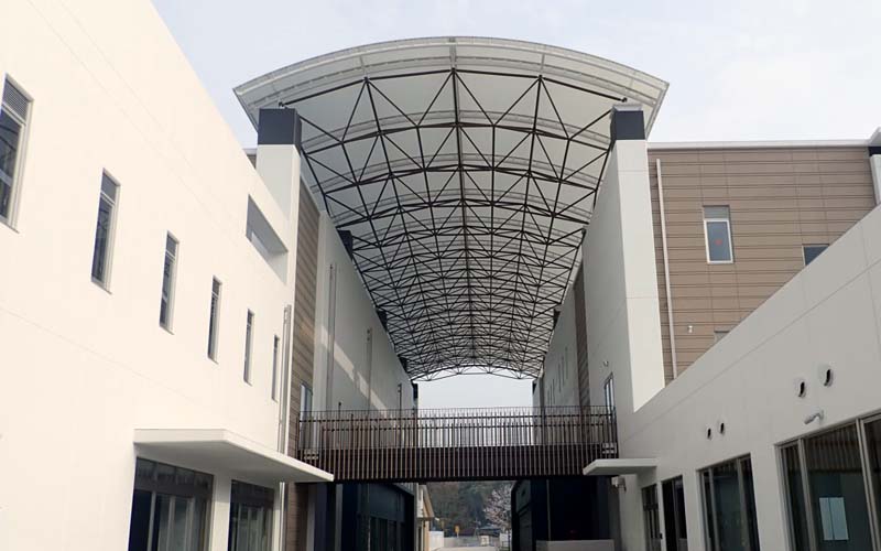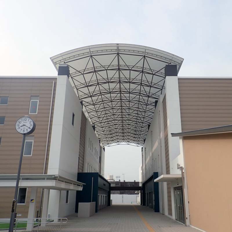■内容 校舎~体育館の通路上屋 立体トラス(TMトラス) 611.0㎡ 酸化チタン光触媒コーティング膜(FGT-600) 638.0㎡