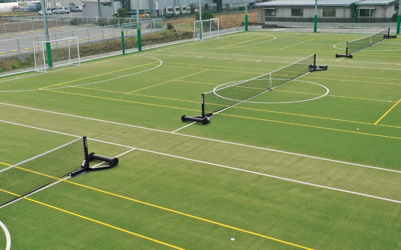 ウェイト一体型テニスポストはポスト基礎工事が不要なので、屋上コートやフットサルコートとの兼用コートに最適です。