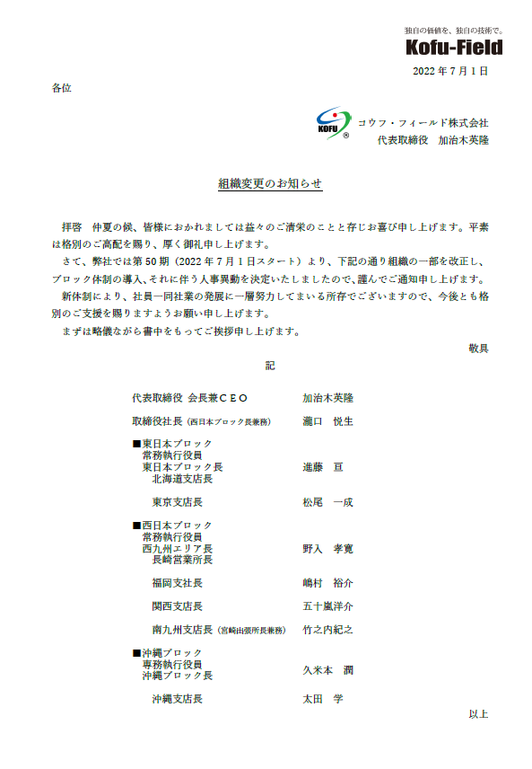 新体制により、社員一同社業の発展に一層努力してまいる所存でございますので、今後とも格別のご支援を賜りますようお願い申し上げます。