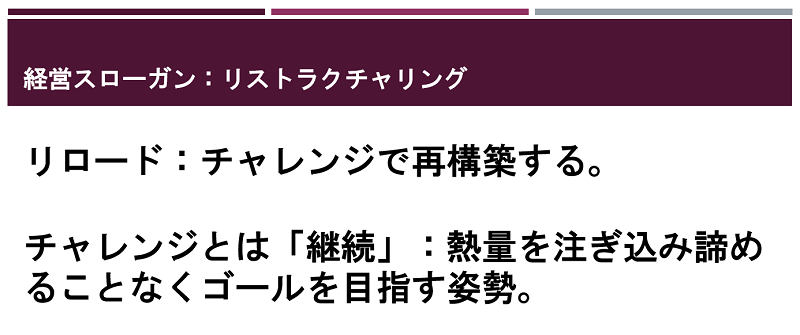 リロード、リフレッシュ、リセット。この3つのRでリストラクチャリングを成し遂げよう、これが今期掲げている会社スローガンです。