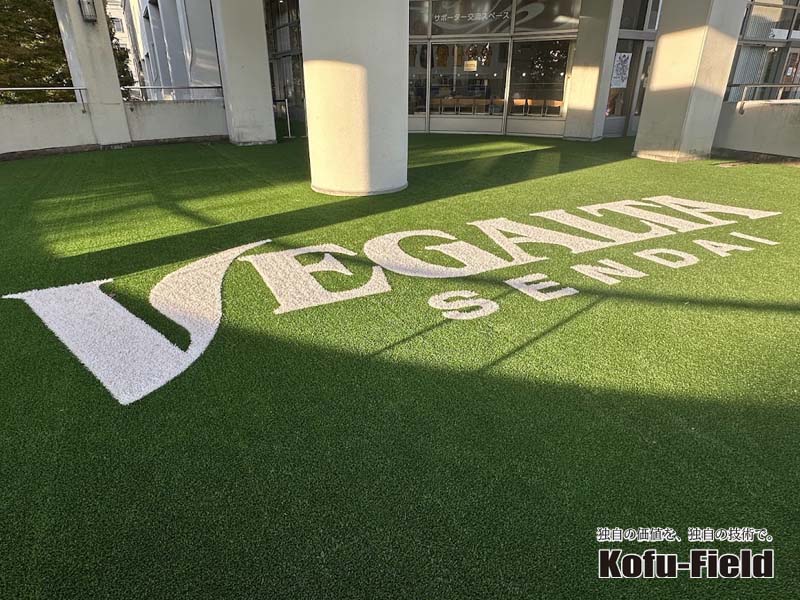 ここはファンと選手のコミュニケーションズゾーンです。コウフ・フィールドでロゴ入り人工芝の施工を担当させてもらいました。