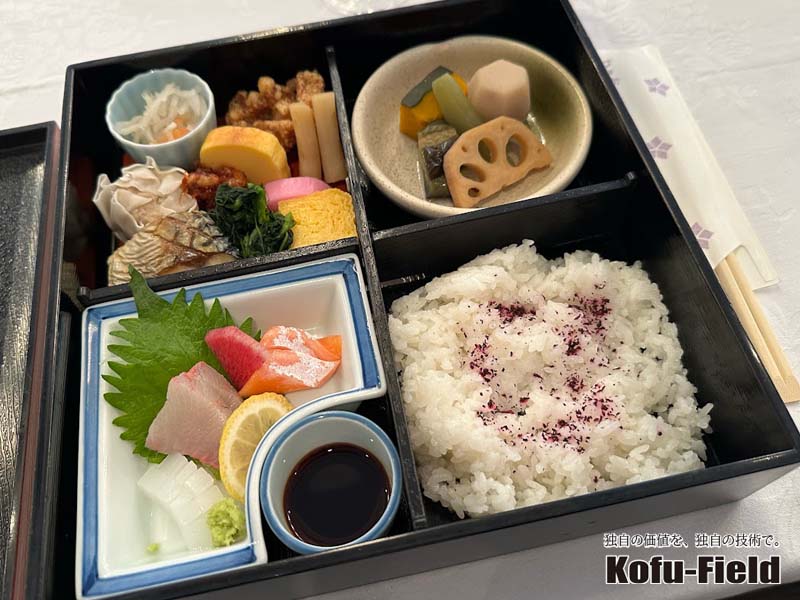 おまけの写真は地元でのランチ紹介。この日は筑後市内での会合後のお弁当です。なかなか豪勢でしたね。でも、これからの暑い季節は刺身が難しいでしょうね。