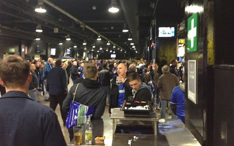プレミアリーグでは、全てのスタジアムで観客席の飲酒を禁止しているため、ほとんどの人がこのような場所で、試合が始まるまでお酒(ビール)を飲んだり、タバコを吸ったりしているんですよね。